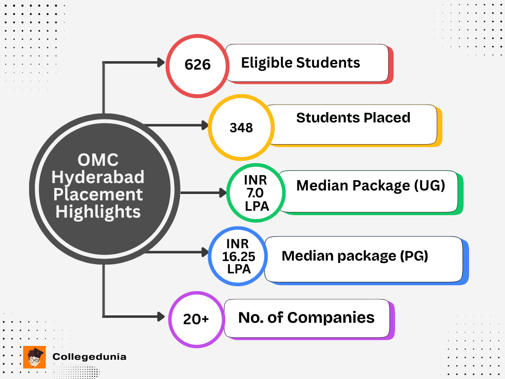 Ans. OMC Hyderabad has not released its final placement data for the academic year 2025; however, as per NIRF data 2024 available, the median package for the UG program stood at INR 7.0 LPA and INR 12.5 LPA for its PG programs in 2024. Over 348 students from UG and PG courses got placed during placement 2024 in various organizations across the country.