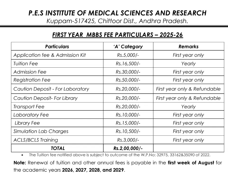 Hostel fees are around Rs 80,000 annually, with a first-year damage charge of Rs 10,000. Scholarships are mainly for A-Category students based on economic status and caste, while B and C categories typically do not receive scholarships. Tuition fees for A, B, and C categories are Rs 100,000, Rs 1,200,000, and Rs 2,700,000, respectively. A compulsory one-year internship in the college hospital is required to graduate, offering practical experience but no stipend. Post-internship, graduates often work in nearby private hospitals or pursue further studies independently, as the college does not offer formal placement services.