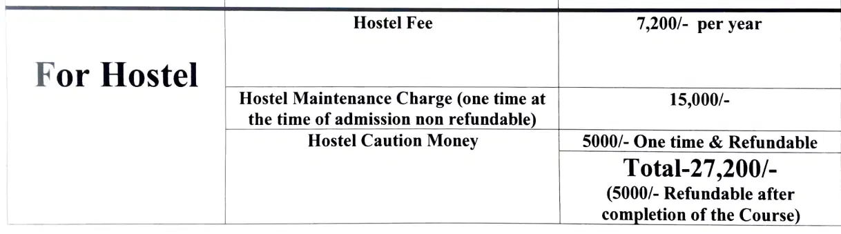 The hostel offers affordable accommodation at only 400-409 INR per month, providing single rooms with a cot, mattress, table, chair, and bookshelf. It includes amenities such as 24-hour electricity, RO drinking water, and daily cleaning services. First-year students share rooms, either 2-seater or 3-seater, but can upgrade to single rooms by the final year, or as early as the second year for male students.