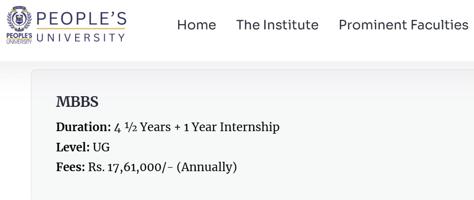 The annual tuition fee is approximately 14,90,000 to 16,80,000 INR, and hostel fees around 1,10,000 INR, both subject to change. For NRIs, the fee is 30,00,000 INR. Despite high costs, it's relatively affordable compared to other private medical colleges. Scholarships for unreserved students aren't provided by the college, but government-funded programs like the Medhavi Chhatra Yojana offer financial aid for eligible students. The college mandates a one-year internship at People's Hospital, with a stipend of Rs 13,900 per month, aligning with regional norms.