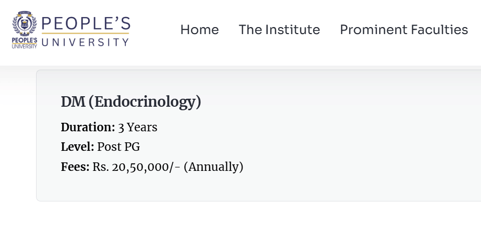 DM Endocrinology at People's College of Medical Sciences & Research Centre Bhopal is a 3 years, Full Time Degree program offered On Campus. It offers a limited number of 2 seats.