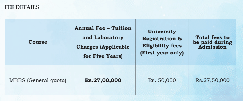 The course duration is 5.5 years, including a one-year mandatory internship with a stipend of Rs. 20,000 per month. The annual fee is around Rs. 23.4 lakh, totaling approximately Rs. 1.11 crore for the entire course, not covering additional expenses like hostel or equipment. Scholarships and fee concessions are available for merit students and those from economically weaker backgrounds. Despite high fees, the college is recognized for its excellent facilities and education, boasting an 80% placement rate.