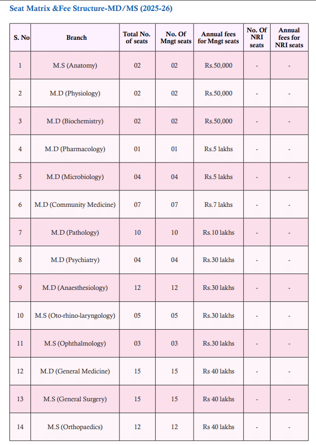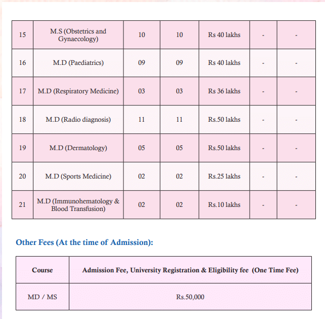 The fee for a general seat is Rs. 35 lakhs per year, plus additional fees of Rs. 40,000, excluding hostel charges. The total cost is notably high. Graduates can work as senior residents, open their own clinics, or seek roles such as Associate Consultant or General Surgeon in various hospitals.