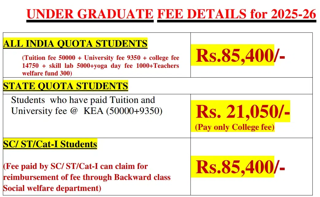 Scholarships are available through external sources like Vidyasiri, Vidyasarathi, and MHRD, with additional financial aid options based on economic backgrounds and caste. Recent fee adjustments have set CET fees at approximately Rs 59,800 and college fees at Rs 8,500. General category students pay Rs 60,100 to KEA, while SC/ST students pay Rs 500, plus Rs 20,000 to the institute for various fees. Post-internship, students have diverse job opportunities, mainly in the associated hospital, with salaries ranging from Rs.