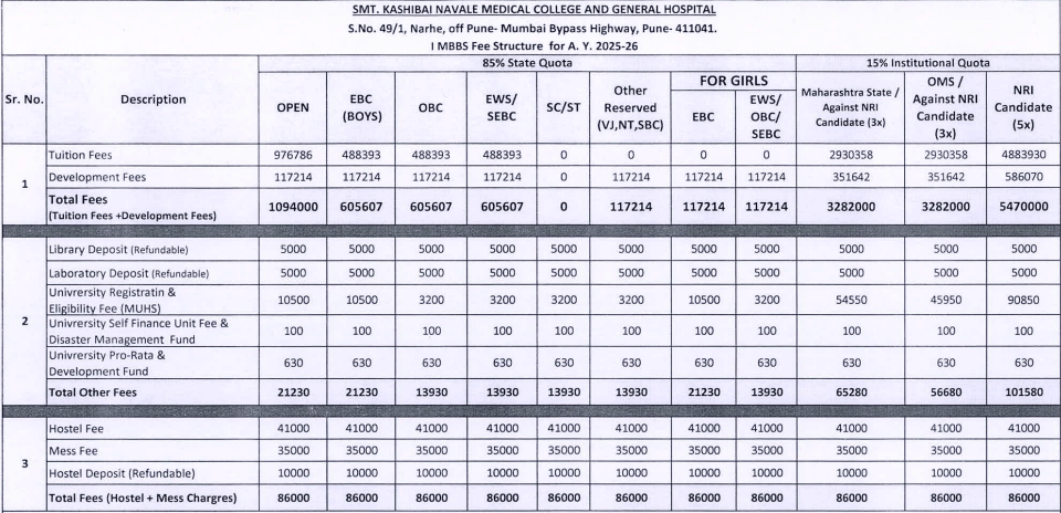 Smt Kashibai Navale Medical College and General Hospital Pune MBBS is offered as 5 Years 6 Months Full Time program, with total intake of 150 seats. The minimum eligibility criteria for MBBS is 10+2 with 50% + NEET. The total fees for Smt Kashibai Navale Medical College and General Hospital Pune MBBS in 2025 is ₹ 50.22 Lakhs for the complete course duration, which includes total tuition fees of ₹ 48.84 Lakhs. Earlier, the fees in 2023 - 2024 for MBBS was ₹ 71.33 Lakhs.