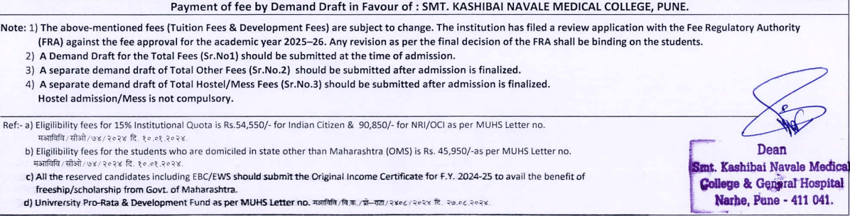 The minimum eligibility for admission to MBBS at Smt Kashibai Navale Medical College and General Hospital Pune is 10+2 with 50% + NEET. Candidates are allotted seats based on Maharashtra-NEET-Counselling.