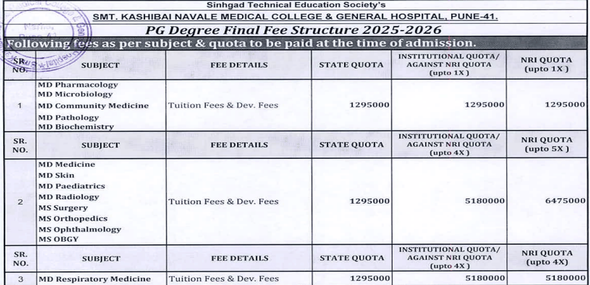 Smt Kashibai Navale Medical College and General Hospital Pune M.D Medicine fees in first year is ₹ 13.81 Lakhs. The detailed fees is mentioned below.Smt Kashibai Navale Medical College and General Hospital Pune Hostel Fee is ₹ 2.24 Lakhs.