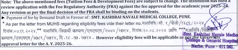 Smt Kashibai Navale Medical College and General Hospital Pune M.D Medicine is offered as 3 Years Full Time program. The minimum eligibility criteria for M.D is MBBS +NEET PG. The total fees for Smt Kashibai Navale Medical College and General Hospital Pune M.D Medicine in 2025 is ₹ 39.71 Lakhs for the complete course duration, which includes total tuition fees of ₹ 38.85 Lakhs. Earlier, the fees in 2023 - 2024 for M.D Medicine was ₹ 39.61 Lakhs.