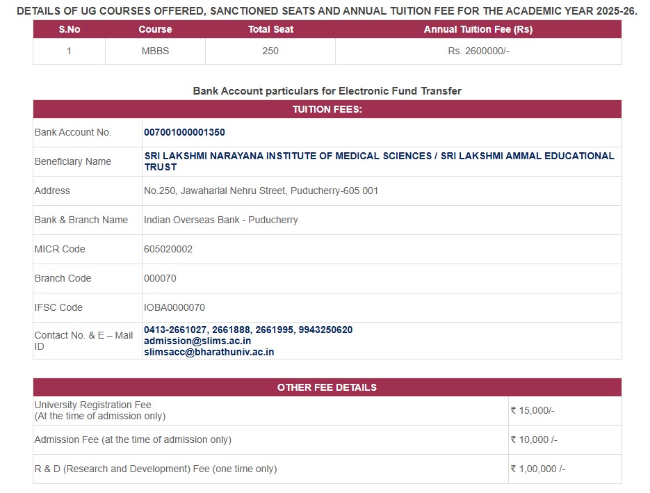 Admission to Sri Lakshmi Narayana Institute of Medical Sciences (SLIMS) in Puducherry requires clearing the NEET exam. After qualifying, candidates complete further documentation and counseling rounds for college allotment based on their NEET scores. The faculty at SLIMS is generally well-regarded, with an emphasis on supportive and engaging teaching methods. The college charges an annual fee of approximately 19.5 lakh INR, which is considered average for private medical institutions. Additional expenses include hostel and exam fees, and financial assistance is available through bank loans.
