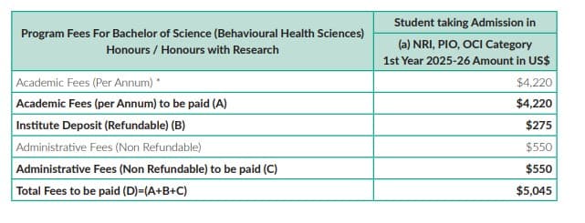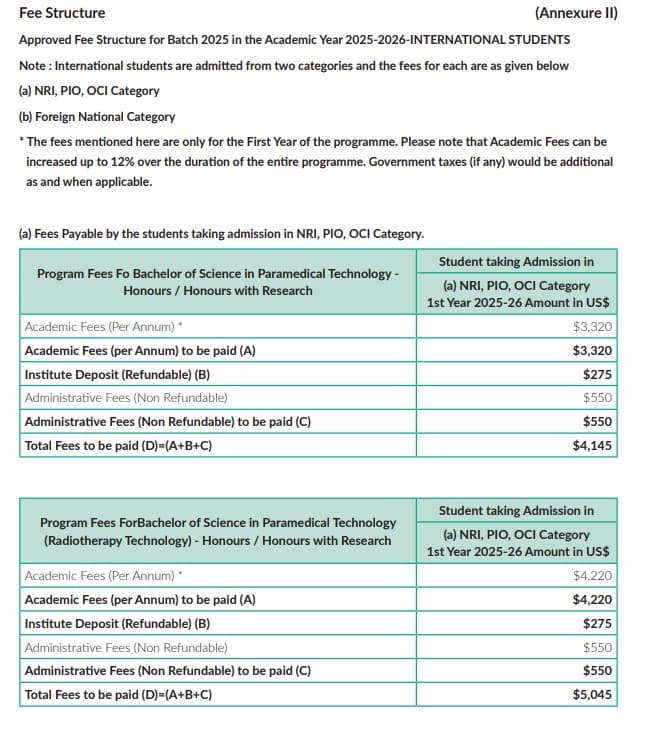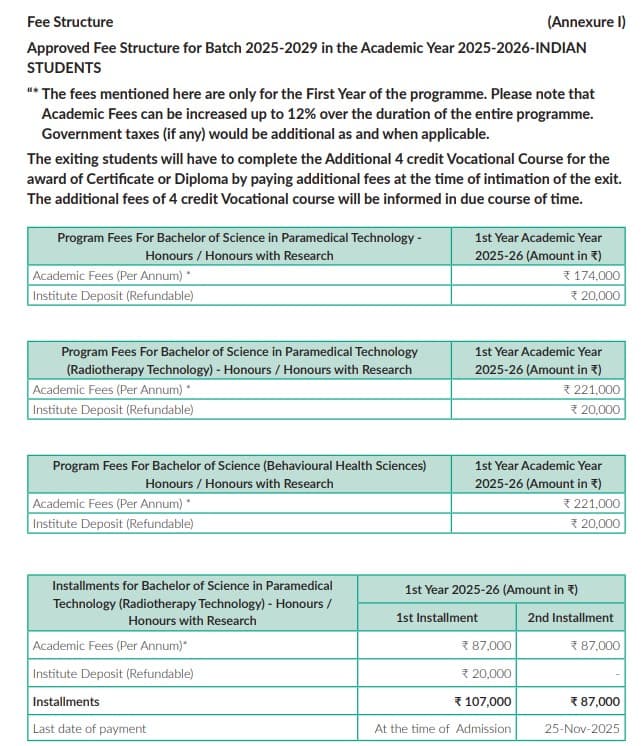 - This includes a total tuition fee of ₹ 6.96 Lakhs, Caution Fees of ₹ 20,000, Other Fees of ₹ 3.55 Lakhs.