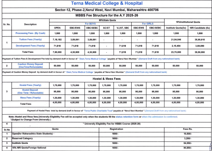 05 Aug, 2025 Terna Medical College Navi Mumbai M.B.B.S. Fee structure 2025-26 has been released. The total academic fee is ₹ 40.03 Lakhs.