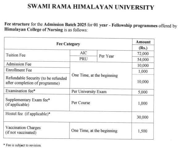 Himalayan College of Nursing Dehradun Fellowship Critical Care Medicine fees 2025 is ₹ 1.3 Lakhs for the entire course duration.