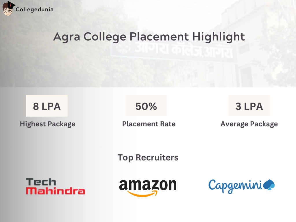 Agra College Placement 2025 report has not been released yet. However, as per students' reviews on Collegedunia, the highest package is offered at INR 8 LPA, while the average package is INR 3 LPA. IBM, Capgemini, Tech Mahindra, Amazon, Wipro, NTT Data, TCS, and many others have been past recruiters at Agra College Placement.