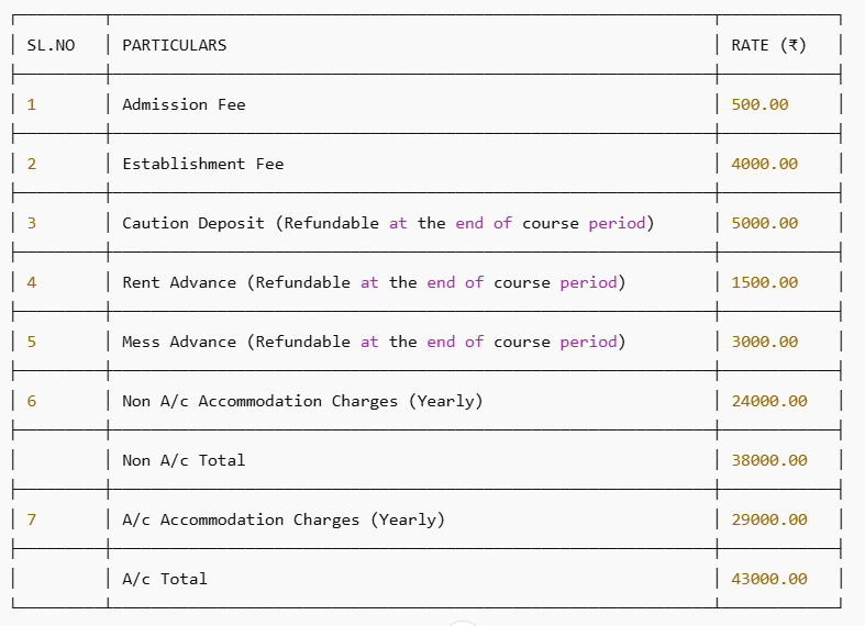 Hostel facilities are below average. Room facilities are ok. There are study tables and bed provided in the hostel room. Meal quality is very poor. Most of the time we won't be able to eat that food. It's a common complaint here. Hostel fees is about 16500 per year. And mess fees is about 3200 per month.