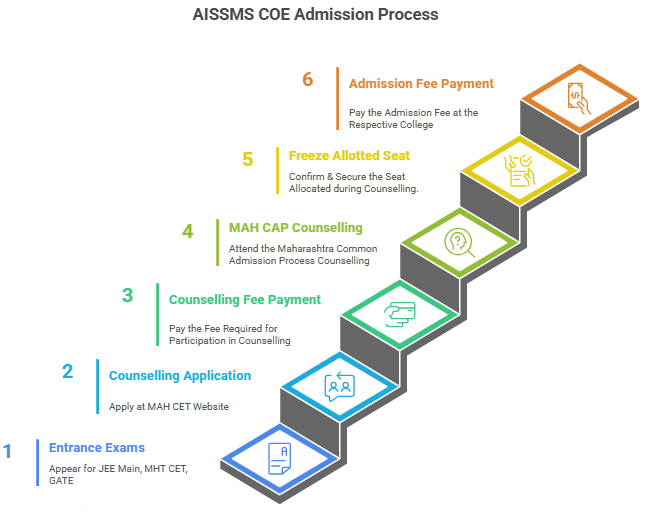 The Bachelor of Engineering (BE) program in Computer Engineering at AISSMS College of Engineering admits students primarily through the MHT CET and JEE entrance exams. For MHT CET, the cutoff percentile generally ranges around 94 to 95 for the open category. JEE-based admissions consider a lower cutoff, around 56%. Prospective students are required to have completed their Class 12 education with a minimum of 150 marks in Physics, Chemistry, and Biology.