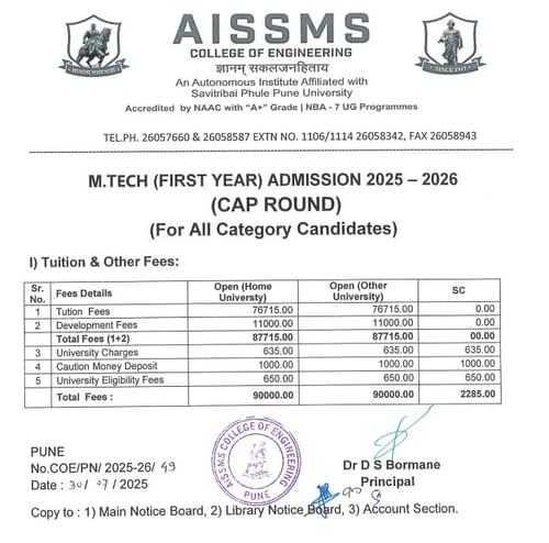 Comparing the course fees at these colleges, the total course fee at AISSMSCOE is the highest with ₹ 1.83 Lakhs. This is followed by AISSMS Institute of Information Technology Pune with ₹ 0 Among these, AISSMS Institute of Information Technology Pune has the lowest fee for M.Tech Power Electronics And Drives with ₹ 0.