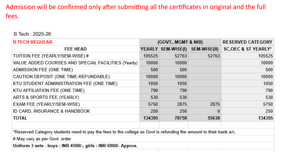 In response, the college plans to highlight student projects to increase company interest, starting this year. The college also hosts Kerala's first Technology Business Incubator (TBI), offering students paid internship opportunities both within and outside the incubator. The annual fee for the course is 100,500 rupees, with an initial payment of around 1,28,000 rupees at admission, covering various costs including tuition and lab fees. This fee structure is uniform for all students except Catholics, for whom specific fee details are not mentioned.