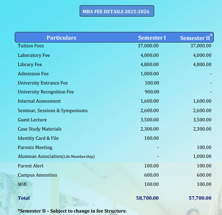 Fatima College Madurai MBA Finance fees 2025 is ₹ 2.34 Lakhs for the entire course duration.