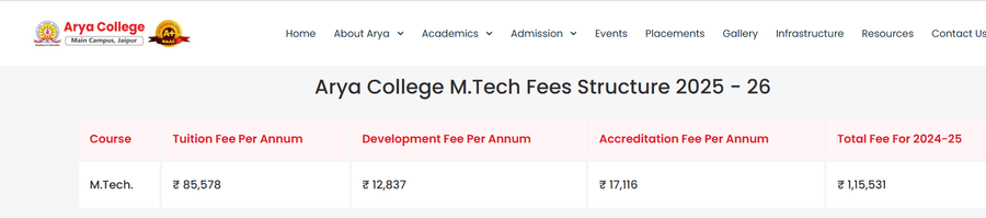 Arya College of Engineering Jaipur M.Tech Civil Engineering fees 2025 is ₹ 2.41 Lakhs for the entire course duration.