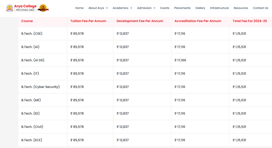 Earlier, B.Tech Electrical Engineering fees at Arya College of Engineering Jaipur was ₹ 3.84 Lakhs (in 2021) for the entire course duration. This shows a fee increase of ₹ 87,188 over the year.