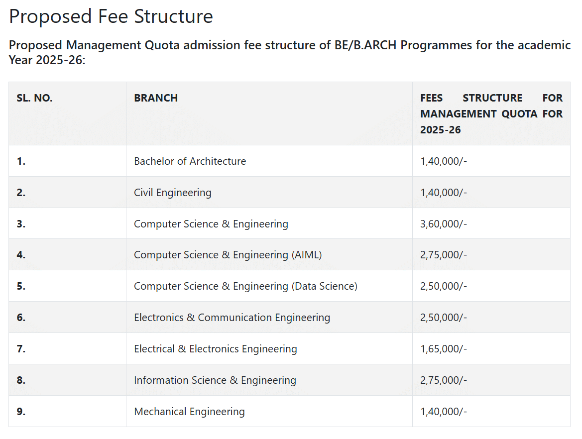 While the teaching is good, some faculty members are less effective. The college emphasizes student-faculty interaction, especially for slow learners. The fee structure includes examination, development, and library charges, varying by quota and course. Electrical Engineering fees range from INR 90,000 to 100,000, while Electronics and Communication Engineering fees range from INR 110,000 to 130,000, with total education costs reaching up to INR 120,000 annually. Scholarships and loans are available, including the Vidyasiri scholarship offering INR 21,000 to 77,000 based on category.