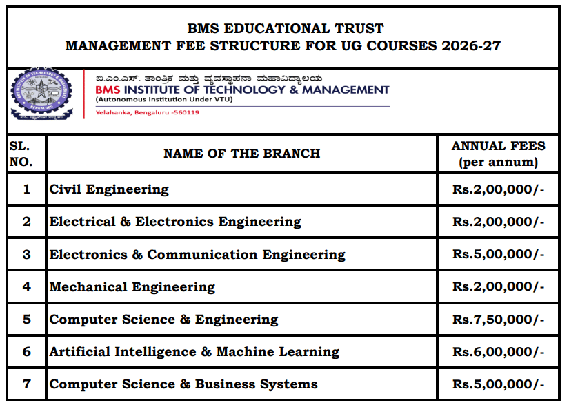09 Feb, 2026 BMSIT BE {Lateral} Artificial Intelligence & Machine Learning Fee Structure 2026-27 has been released. The total academic fee is ₹ 18 Lakhs.