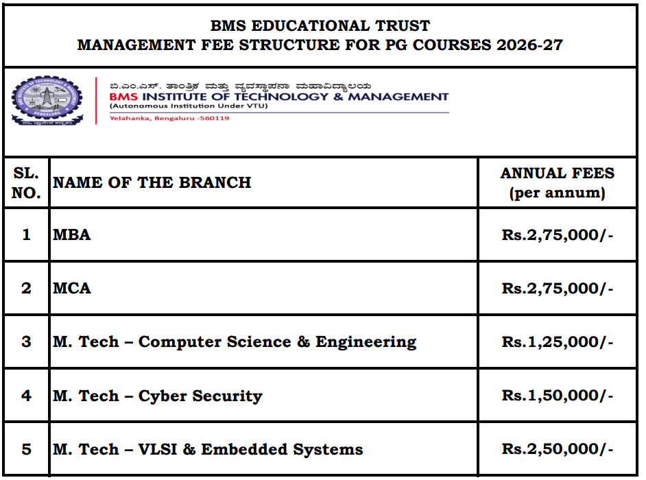 09 Feb, 2026 BMSIT has released the Fee Structure 2026-27 for various M.Tech Computer Science And Engineering programs. The total academic fee is ₹ 2.5 Lakhs.