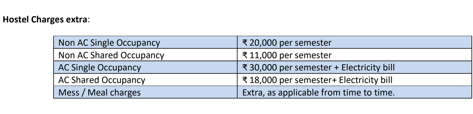 | AC Single occupancy | Rs 25000 per semester / Rs 50000 annually | ||||||