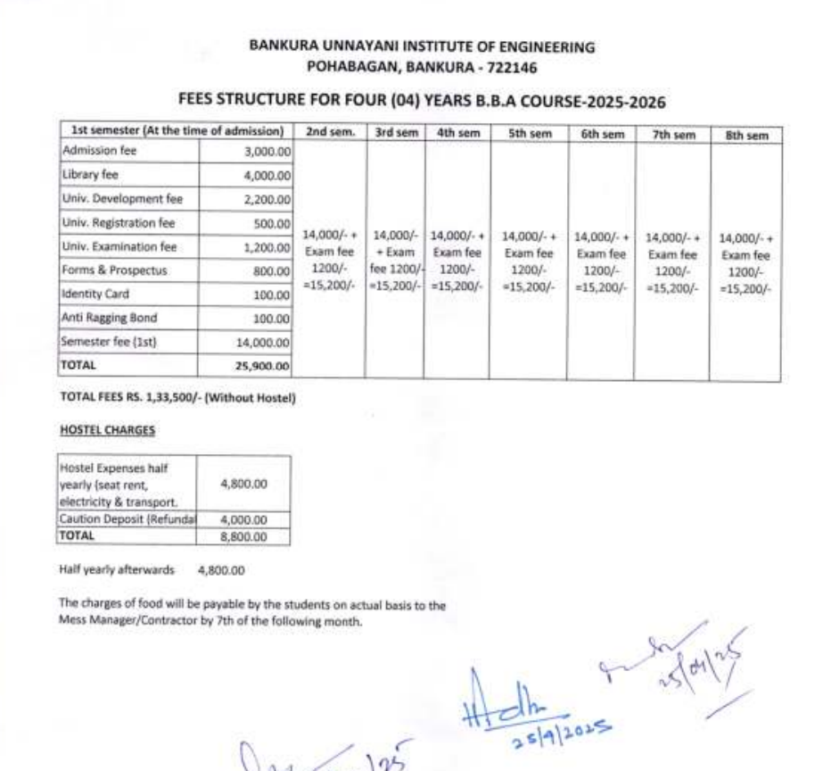 Bankura Unnayani Institute of Engineering BBA fees in first year is ₹ 41,100. The detailed fees is mentioned below.Check Bankura Unnayani Institute of Engineering Admission 2025
