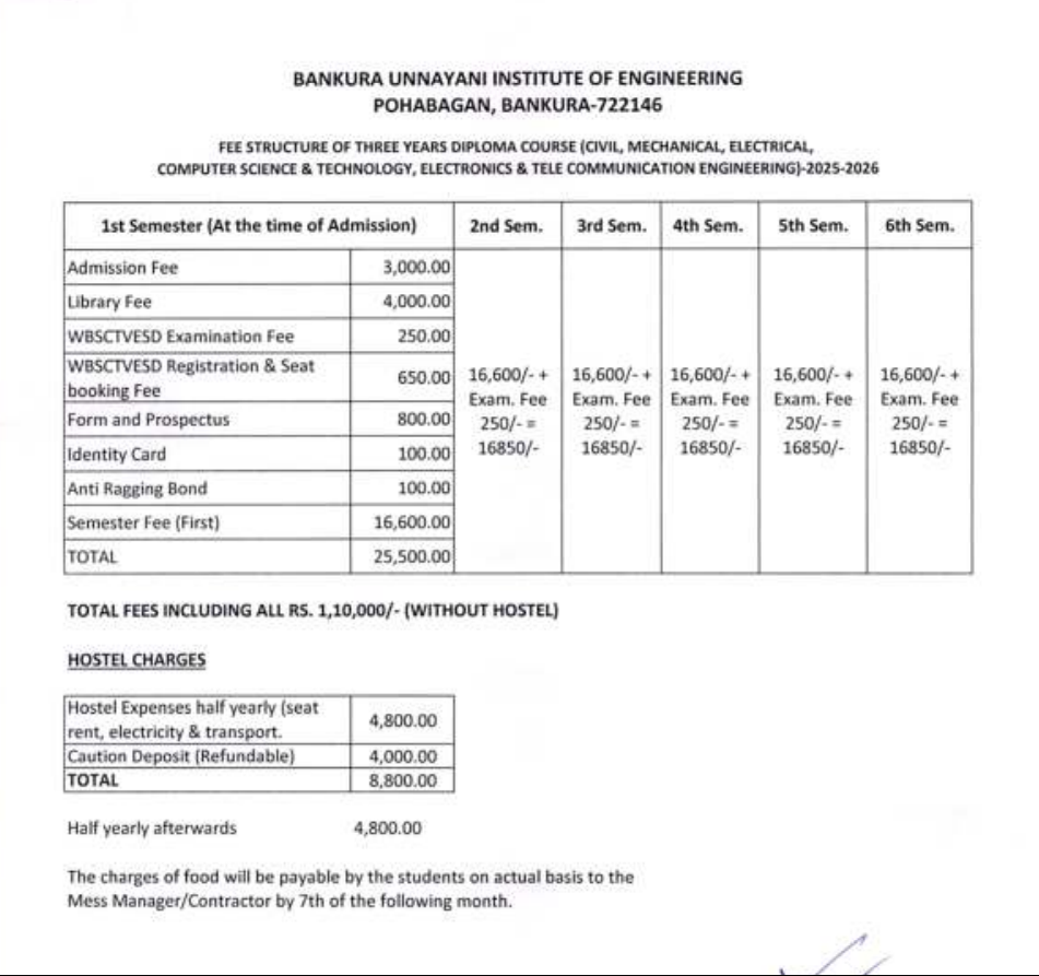 Bankura Unnayani Institute of Engineering Polytechnic Civil Engineering fees in first year is ₹ 42,350. The detailed fees is mentioned below.Check Bankura Unnayani Institute of Engineering Admission 2025