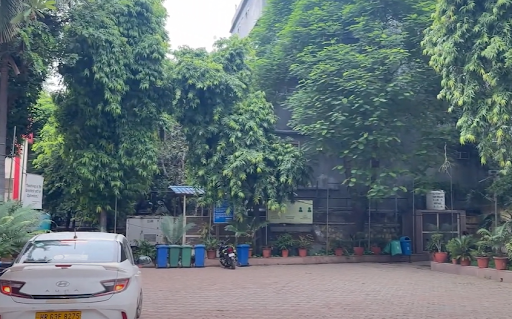The campus embraces eco-friendly practices such as rainwater harvesting, partial solar panel installations, and green landscaping.