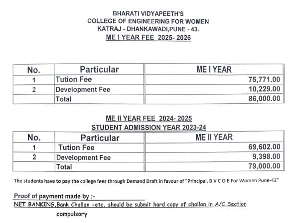 30 Aug, 2025 Bharati Vidyapeeth College of Engineering For Women Pune M.E Embedded System And Vlsi Design Fee structure 2025-26 has been released. The Academic Fee is ₹ 86,000 /Yr.