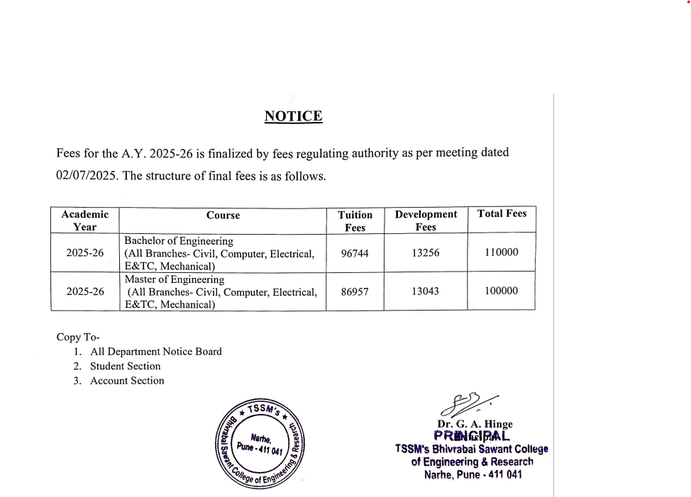 Bhivarabai Sawant College of Engineering & Research Narhe ME Design Engineering is offered as 2 Years Full Time program, with total intake of 24 seats. The minimum eligibility criteria for ME is Graduation. The total fees for Bhivarabai Sawant College of Engineering & Research Narhe ME Design Engineering in 2025 is ₹ 2 Lakhs for the complete course duration. Earlier, the fees in 2021 - 2022 for ME Design Engineering was ₹ 1.94 Lakhs.