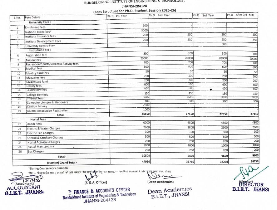 22 Dec, 2025 BIET Jhansi has released the Ph.D Fee Structure 2025-26. The total academic fee is ₹ 1.19 Lakhs.