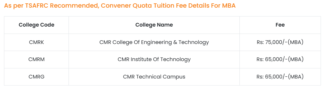 Students have an option to pursue MBA from similar colleges such as CMR Technical Campus Hyderabad, CMRCET, CMRIT Hyderabad, CMR Group of Institutions Hyderabad. Similar to CMRCET, MBA at these group colleges is offered Full Time for a duration of 2 Years.