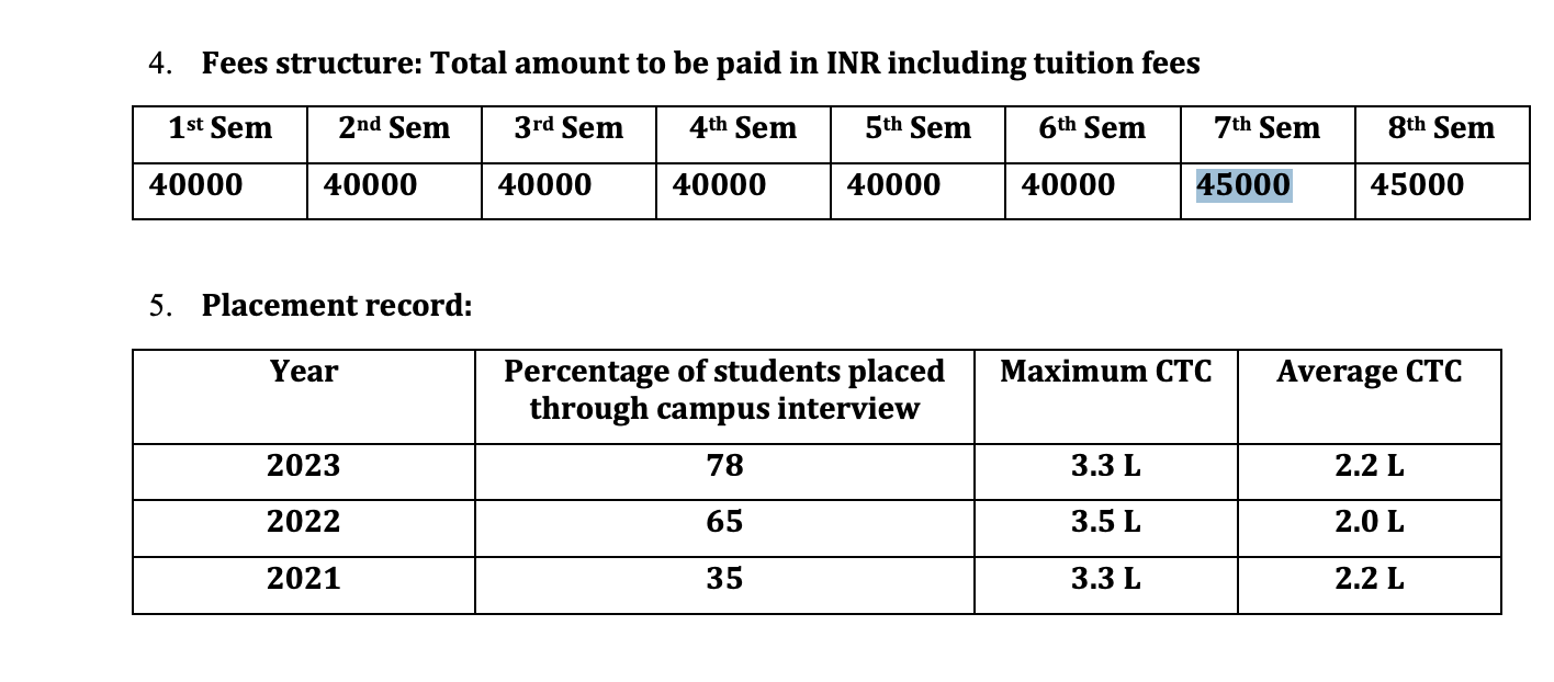 | Semester Wise Fees | ₹40000 | ₹40000 | ₹40000 | ₹40000 | ₹40000 | ₹40000 | ₹45000 | ₹45000 |