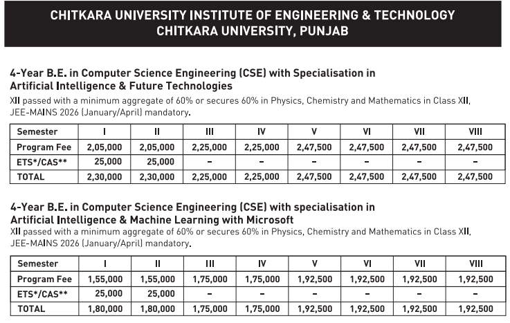 07 Feb, 2026 Chitkara Institute of Engineering and Technology Patiala Fee Structure 2026 has been released for BE Artificial Intelligence programs. The total academic fee is ₹ 19 Lakhs.