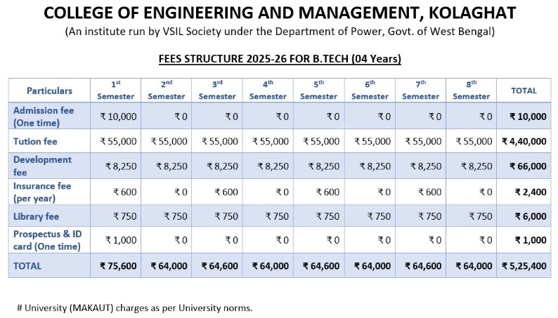 44,000 per semester. The total cost for non-hostel students is approximately Rs. 3.5 lakh, while for hostel residents, it is about Rs. 5.2 lakh, including Rs. 500 monthly room rent and Rs. 25,000-30,000 for mess charges per semester. Scholarships, such as the Swami Vivekananda Merit-Cum-Means Scholarship, and loan options are available for financially needy students. Placement opportunities are strong, especially for the Computer Science and Engineering department, with a 99% placement rate and an overall rate of 80%.