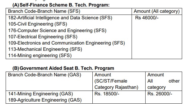 Fees can be paid online or by challan, with additional exam fees of around Rs 1,300. Fees are divided into two installments, with scholarships available, especially for new students as fees increase annually. Placement opportunities are strong, particularly in Agriculture and Mining, with a 70-80% placement rate and companies like Hindustan Zinc Ltd. and Tata Consultancy Services recruiting. The average package for Mining is INR 9 LPA, with the highest being INR 25 LPA in the CSE branch during COVID-19.