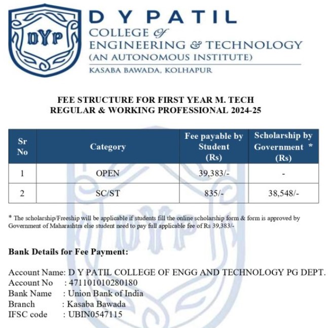 DY Patil College of Engineering and Technology Kolhapur M.Tech Electronics & Telecommunications Engineering Fee has not been released yet. For reference you can check the previous year academic fees in the section below.