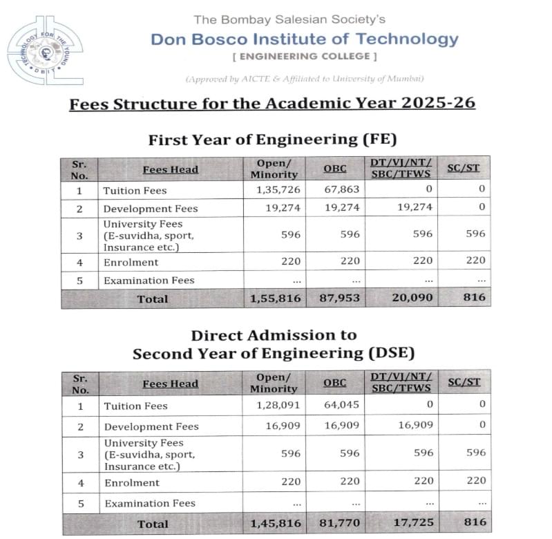 Admission to the college is through the Maharashtra Common Entrance Test (CET) and includes a series of online and offline admission lists. Candidates can choose 'freeze' to confirm admission. Diploma holders with a score of 85.69% can also apply through CAP rounds. The college offers a supportive faculty, who are involved in both academic and extracurricular guidance, with personal mentoring every two weeks. Annual college fees range from 100,000 to 135,000 INR, with open category students paying 1.23 lakhs INR, while economically backward students can access scholarships and loans.