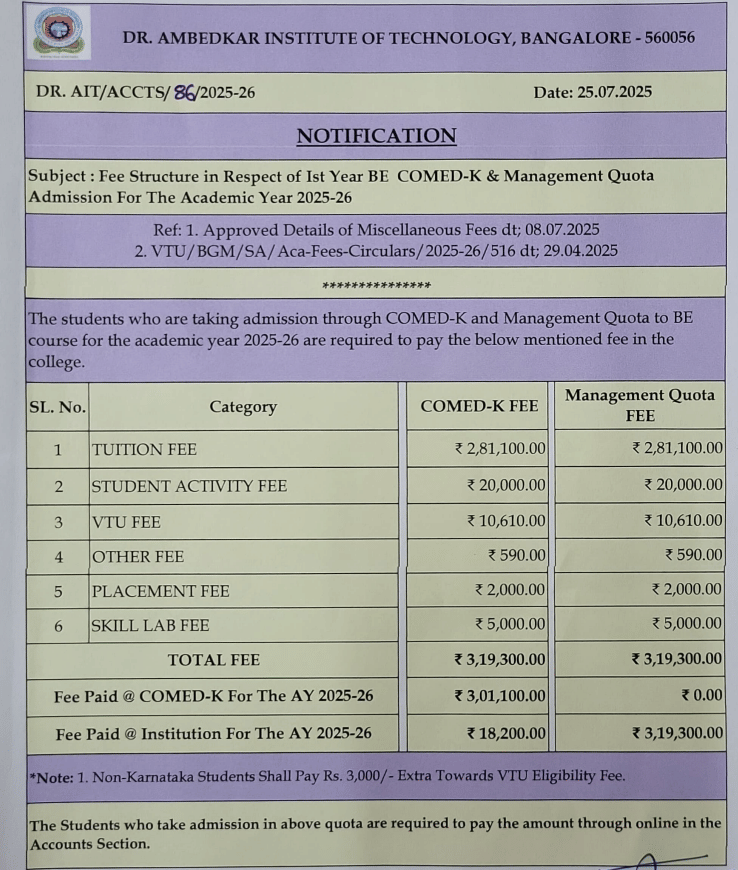 Scholarships, primarily funded by the government, are available based on caste and income, with delays in payment. Tuition fees for government students through KCET range from INR 40,000 to INR 59,250 annually, while management quota fees are 3.5 to 5 lakhs per year. COMEDK students pay about INR 2.64 lakhs for the first year, and hostel fees range from INR 90,000 to 145,000 per year. The official college website provides detailed scholarship information.