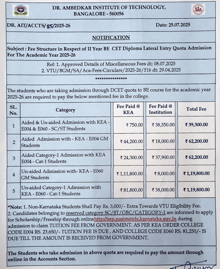 26 Sep, 2025 AIT Bangalore has released its Fee Structure for the academic session 2025-26. The BE {Lateral} Aeronautical Engineering total fees is ₹ 1.87 Lakhs.