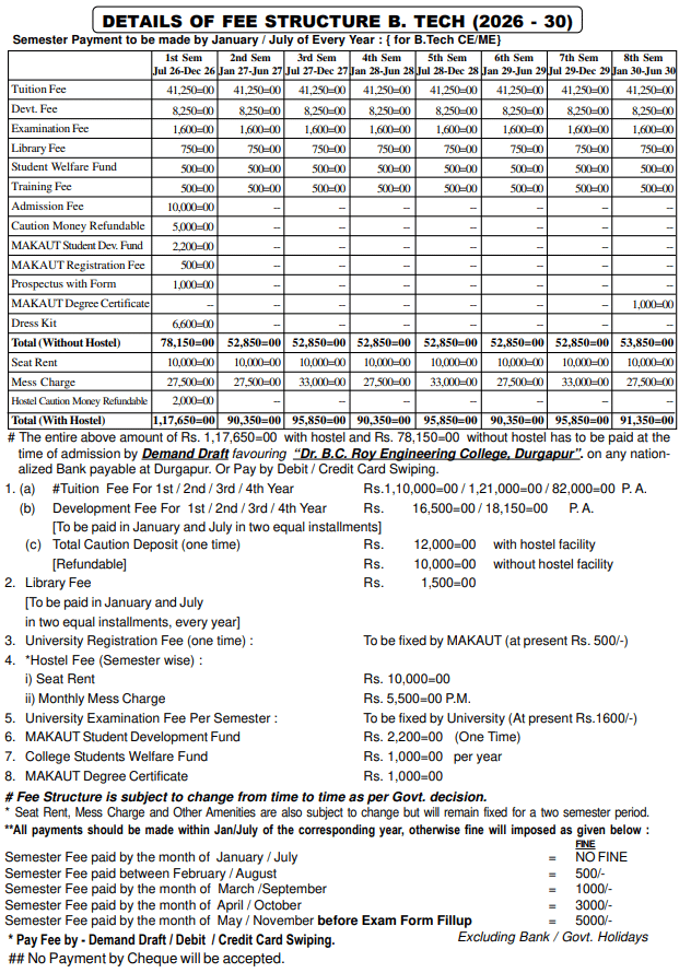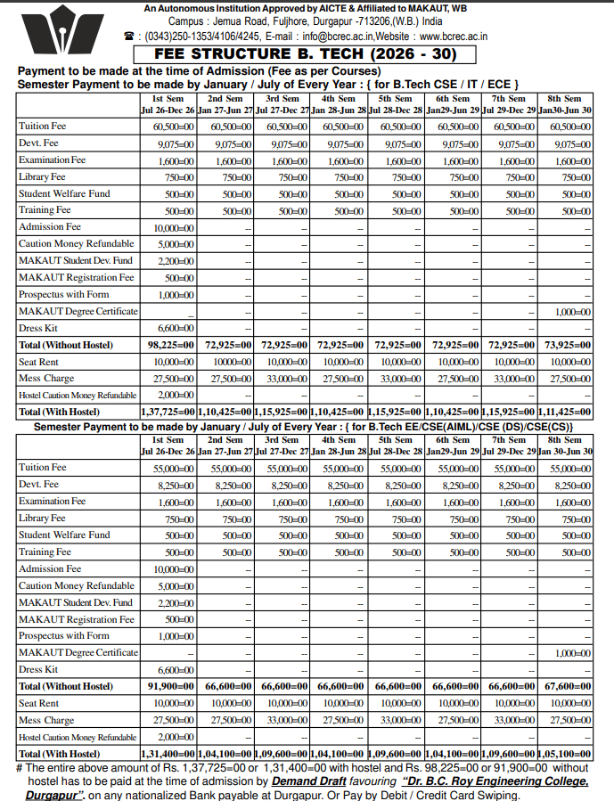 Admission to Dr. B.C. Roy Engineering College, Durgapur, is primarily through the WBJEE, with some seats available via JEE Mains. The college is known for its B.Tech programs, especially in IT and Electronics. Course fees, including hostel facilities, are approximately Rs. 97,000 annually. Tuition fees range from Rs. 28,000 to Rs. 50,000 per semester, with hostel and mess charges around Rs. 3,400 monthly. The total B.Tech program cost is approximately Rs. 3.7 to Rs. 4 lakh, with an additional Rs. 2 lakh for hostel students.