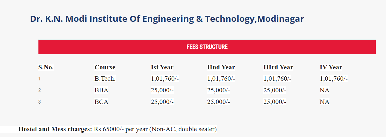 Dr Kedar Nath Modi Institute of Engineering and Technology Modinagar Hostel Fee is ₹ 65,000.