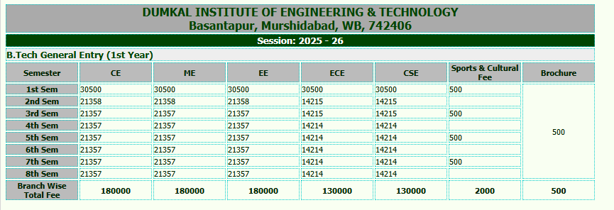 Dumkal Institute of Engineering & Technology Murshidabad B.Tech Computer Science and Engineering is offered as 4 Years Full Time program, with total intake of 60 seats. The minimum eligibility criteria for B.Tech is 10+2. The total fees for Dumkal Institute of Engineering & Technology Murshidabad B.Tech Computer Science and Engineering in 2025 is ₹ 1.33 Lakhs for the complete course duration, which includes total tuition fees of ₹ 1.3 Lakhs. Earlier, the fees in 2022 - 2023 for B.Tech Computer Science and Engineering was ₹ 1.35 Lakhs.
