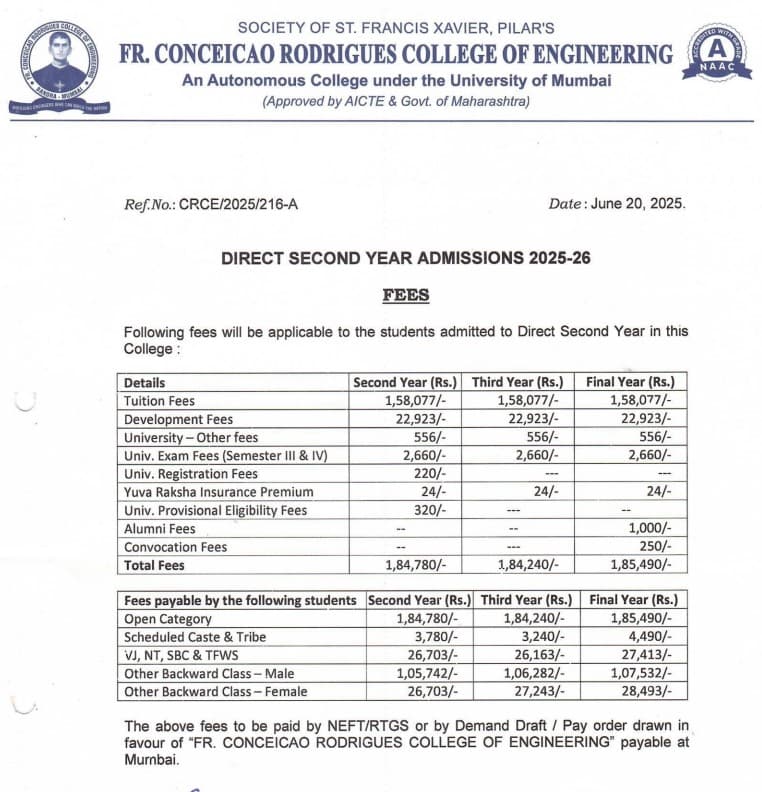 Earlier, B.Tech {Lateral} Electronics & Computer Science fees at Fr. Conceicao Rodrigues College of Engineering Mumbai was ₹ 5.02 Lakhs (in 2024) for the entire course duration. This shows a fee increase of ₹ 52,442 over the year.