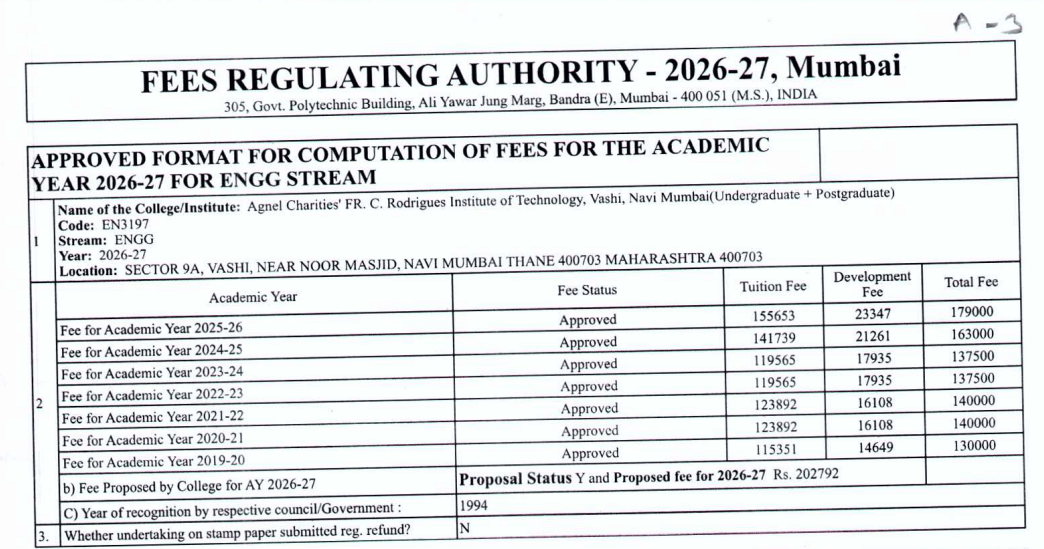 FCRIT B.Tech Electronics & Telecommunication Engineering fees in first year is ₹ 1.89 Lakhs. The detailed fees is mentioned below.FCRIT Hostel Fee is ₹ 90,000.