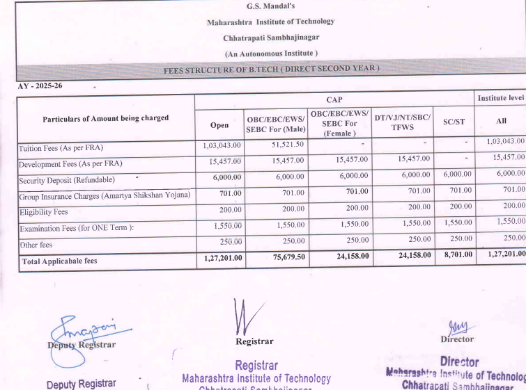 MIT Aurangabad B.Tech {Lateral} Civil Engineering fees in first year is ₹ 1.27 Lakhs. The detailed fees is mentioned below.MIT Aurangabad Hostel Fee for Male is ₹ 38,500 to 81,500. Hostel Fee for Female at MIT Aurangabad is ₹ 41,500 to 61,000.