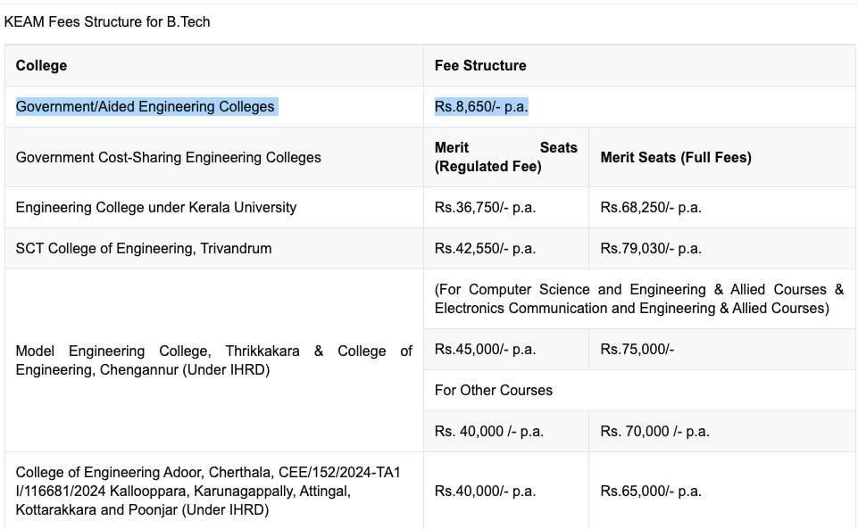 The Government College of Engineering Kannur admits students through the KEAM entrance exam, with admissions managed by the Centralized Allotment Process. The initial joining fee is approximately 10,000 INR, transferrable if students switch colleges. Semester fees range from 5,000 to 8,000 INR, with additional costs such as a hostel fee of 2,500 INR monthly and an exam fee of 900 INR. The total first-year fee is about 13,000 INR, including a 2,000 INR placement fee.